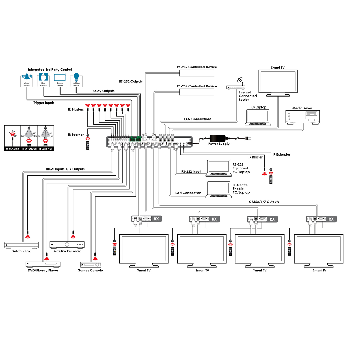 - Supports 1 IR Learning input, 8 IR Blaster outputs, 8 Trigger inputs, 8 Relay outputs, 2 COM ports, and 4 Ethernet ports