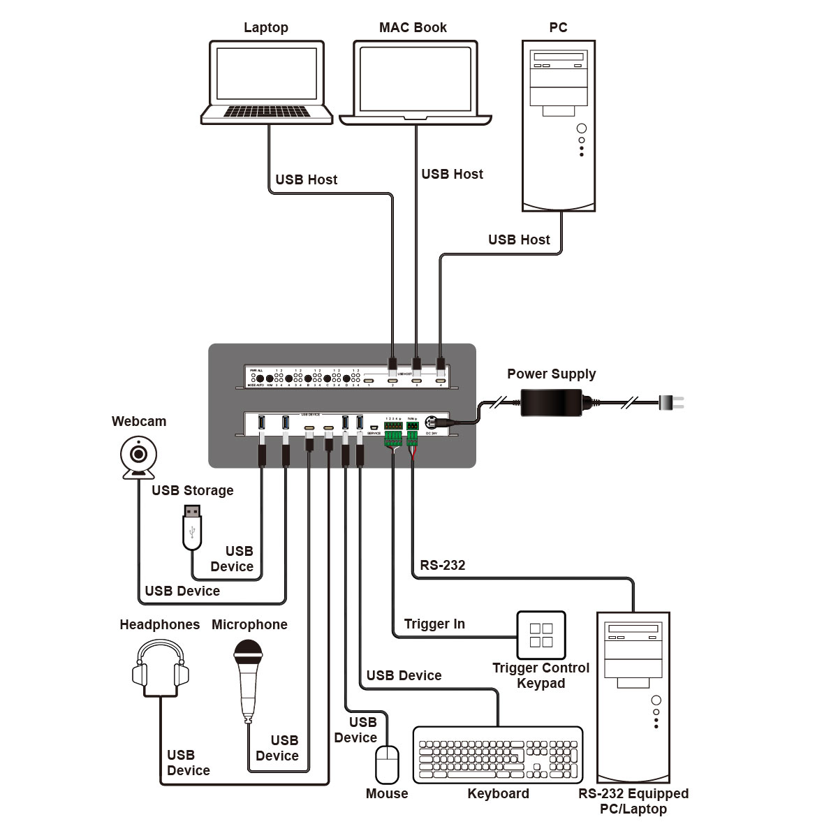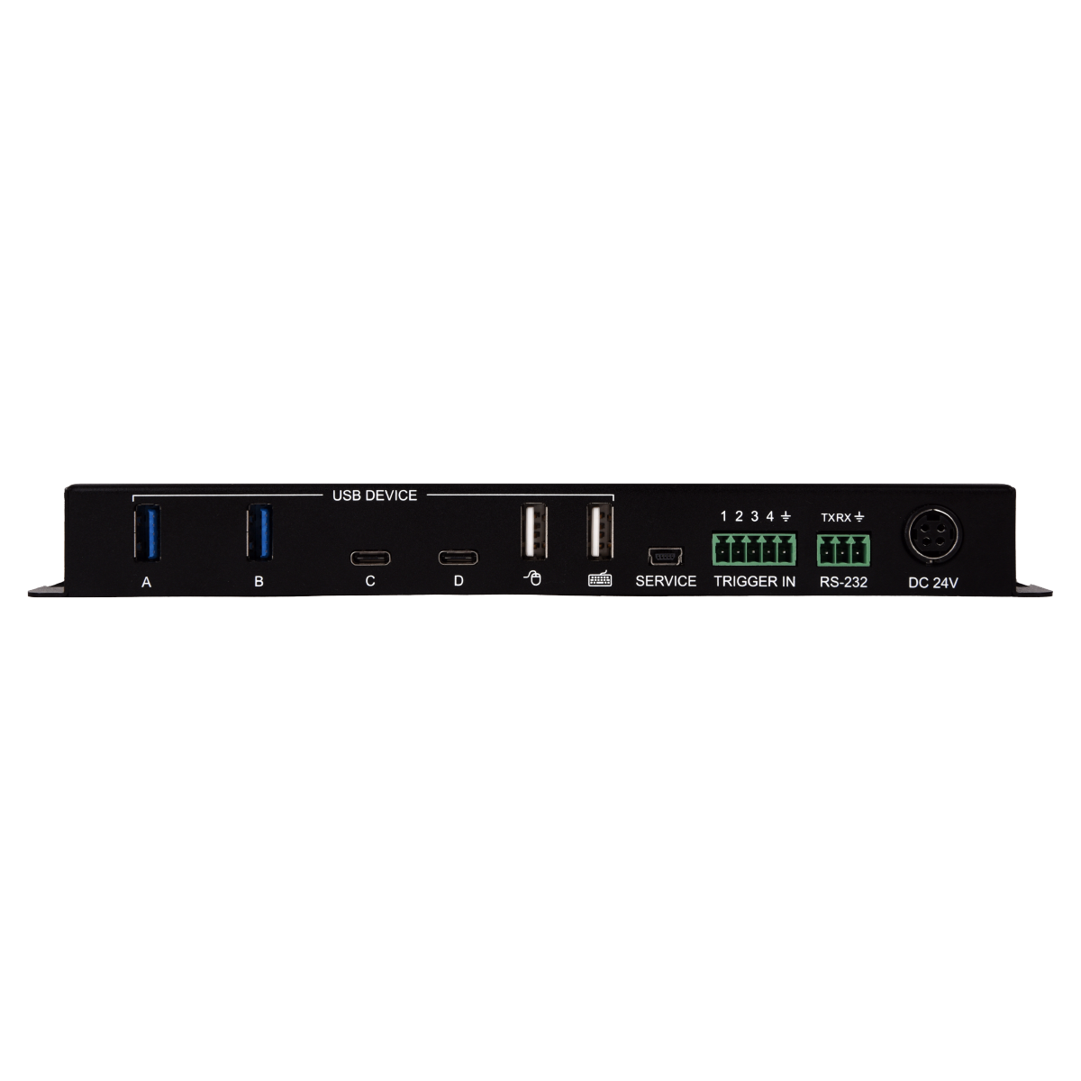 - USB host selection is controllable via front panel buttons or auto connect detection