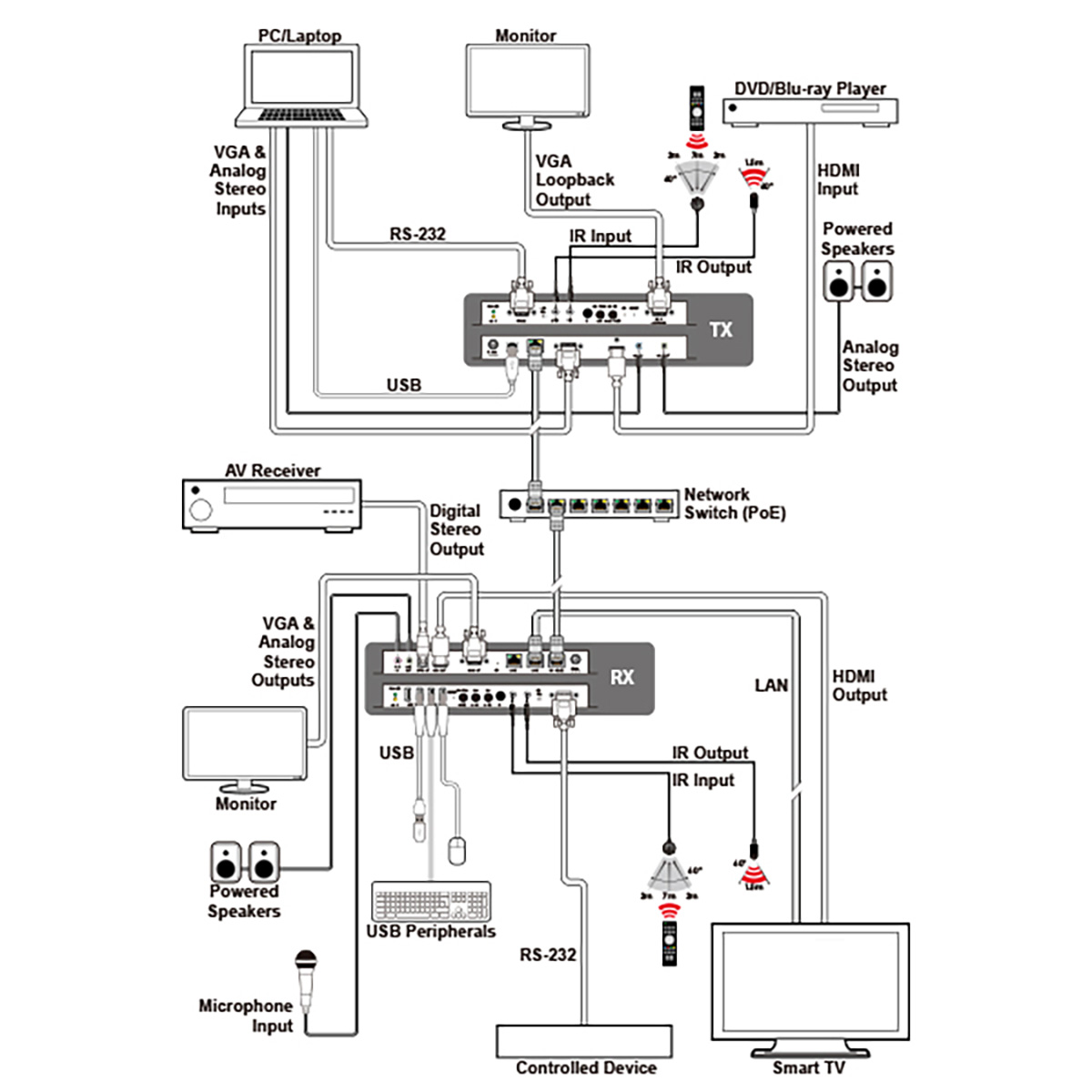- The analog Line In on a connected Transmitter will send audio directly to this Receiver’s analog Line Out as well as being embedded into the HDMI output signal