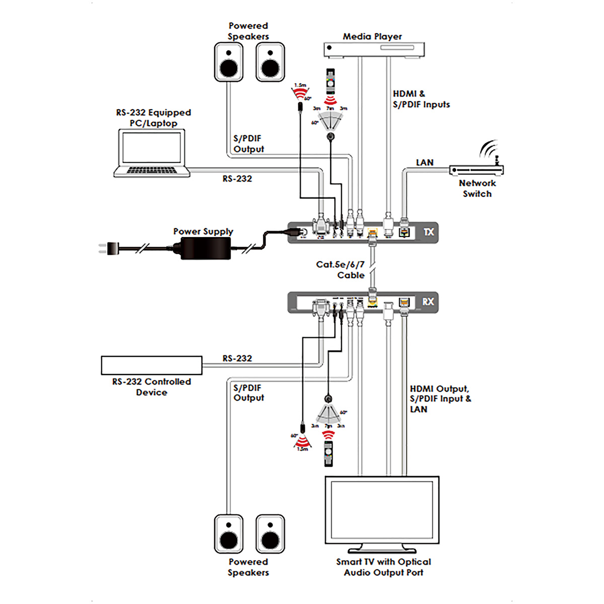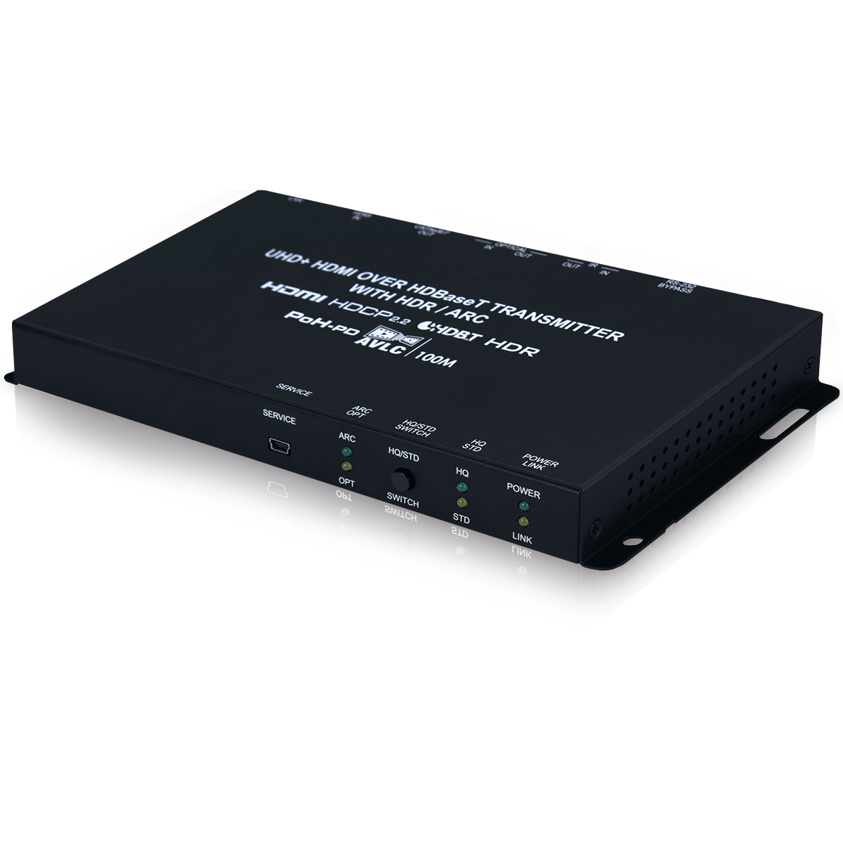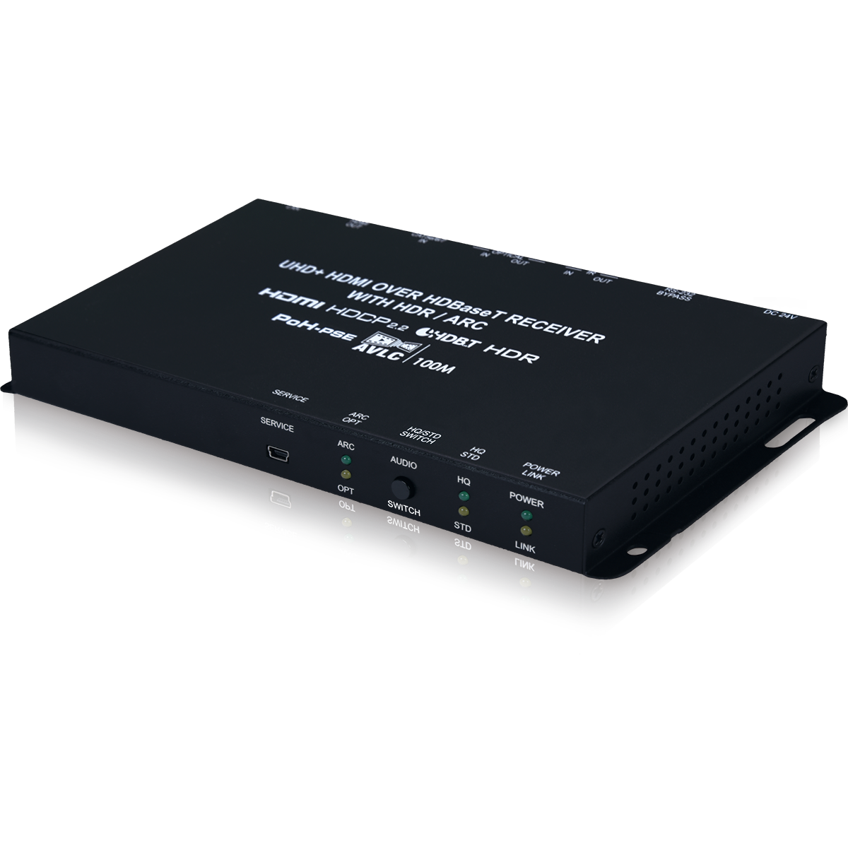 - HDBaseT feature support: HD Video and Audio, 100BaseT Ethernet, 48V PoH (PD), bi-directional optical audio and Control (bi-directional IR/RS-232 pass-through)