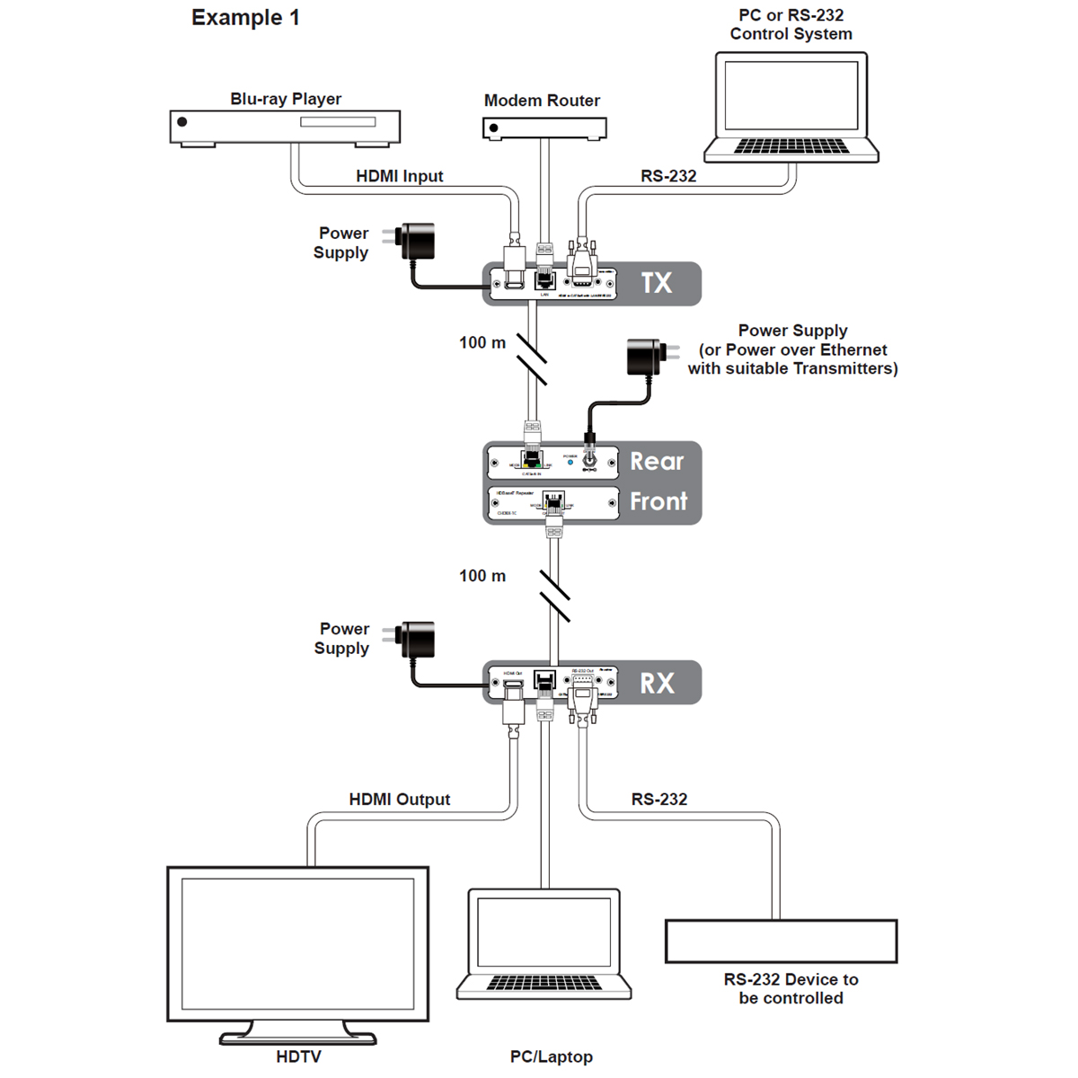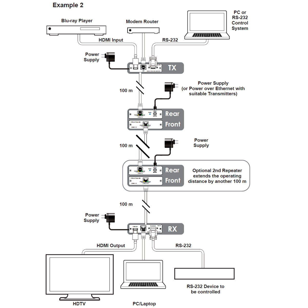 - Doubles up the distance of HDBaseT transmission between transmitter and receiver, with a single repeater