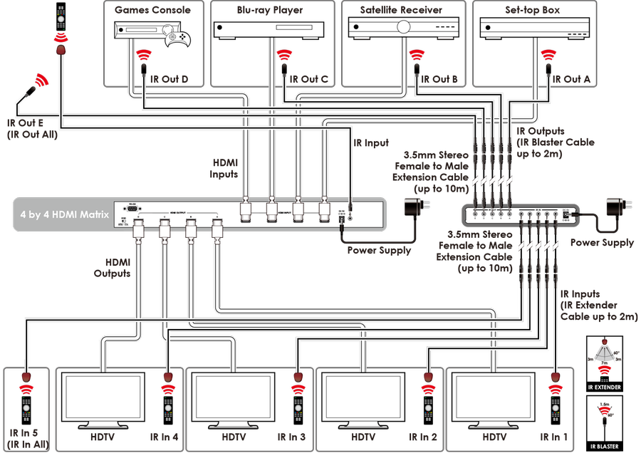 - This device does not send audio/video signals, it only transmits and receives infrared signals to control equipment that is far away, using IR extender cables.