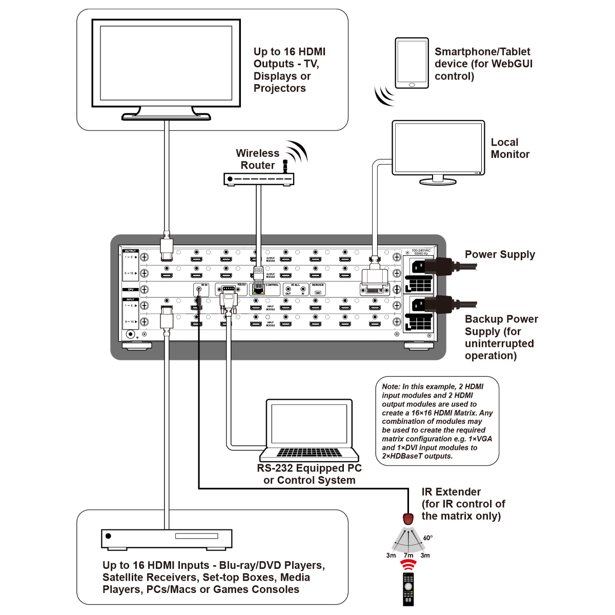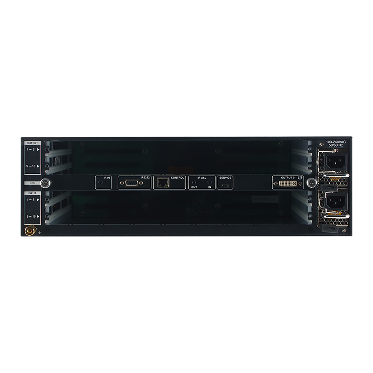 - Input and output module types can be mixed and added in multiples of 8 from 8×8 (1 Input module, 1 Output module) up to 16×16 (2 Input modules, 2 Output modules) with HDMI, DVI, CAT5e/6/7 and VGA (Input only) connection types