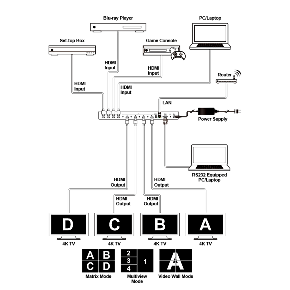 This unit allows the signal from 4 different input sources to be freely selected and arranged on 4 displays, providing output modes (Matrix, Multiview and TV Wall) for various applications. It is an ideal solution for monitoring or displaying multiple sources simultaneously for use in control rooms, conference rooms or classrooms. Video resolutions supports up to 4K@60Hz and is fully compatible with the HDCP up to 2.2 standards.Pass-through of multiple digital audio formats such as LPCM (up to 8 channels), bitstream and HD bitstream at 192kHz are supported. Standard control is available via front panel controls with LCD menu, information OSD, remote control, RS-232, Telnet, and WebGUI making it exceptionally versatile.