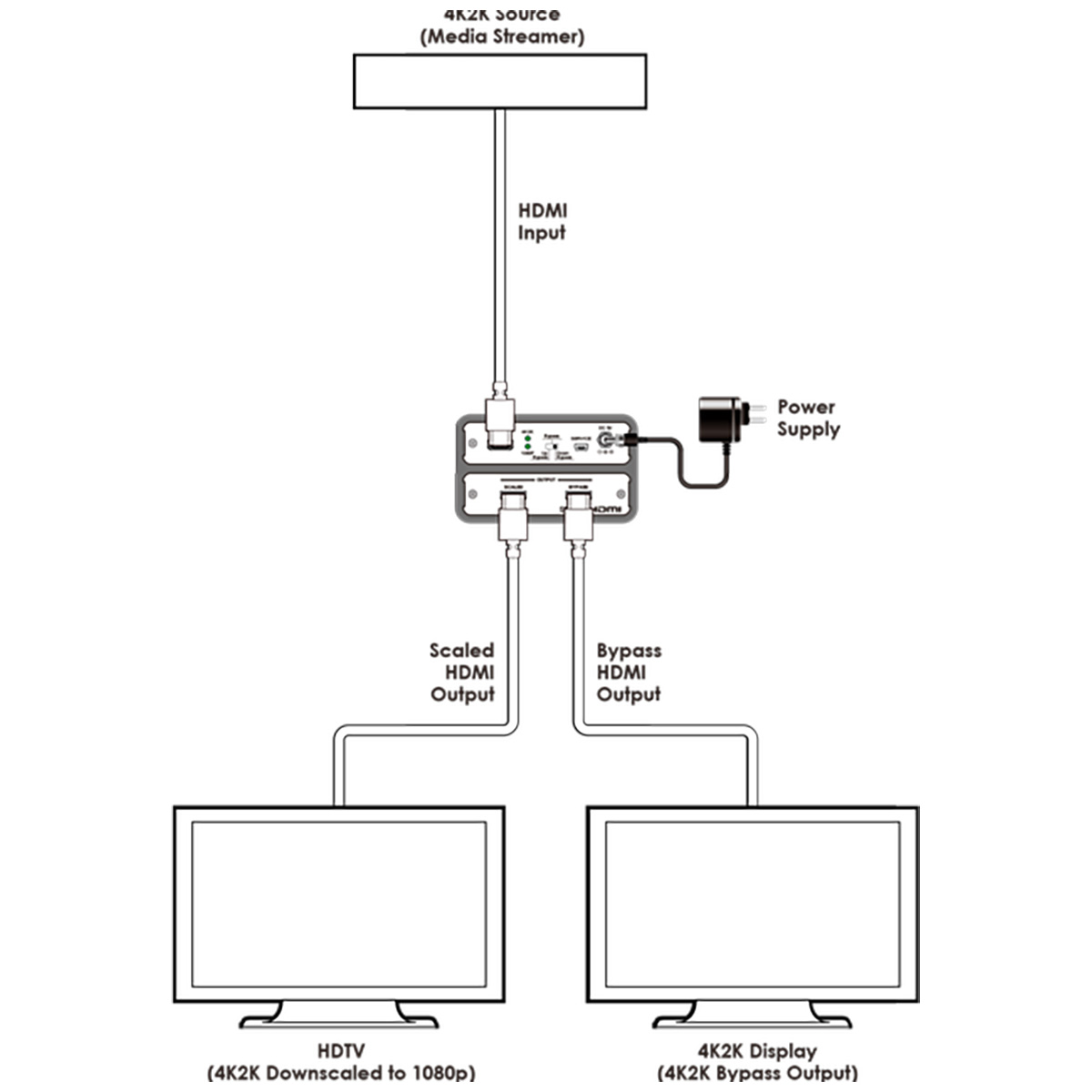 The HDMI 4K2K Scaler is designed to upscale 1080p@24 signal into 4K2K or downscale 4K2K signal into 1080p@24. With friendly and simple design which allows user with direct viewing on input resolution and switching output signal format up to 2 simultaneous HDMI. The HDMI 4K2K Scaler is your best media between HD and Ultra HD signal.