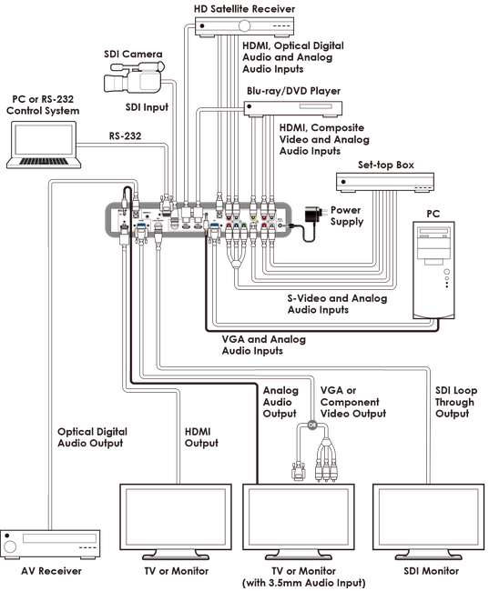 - Supports conversion of multiple video formats and audio input to HDMI or PC/HD and analog stereo outputs