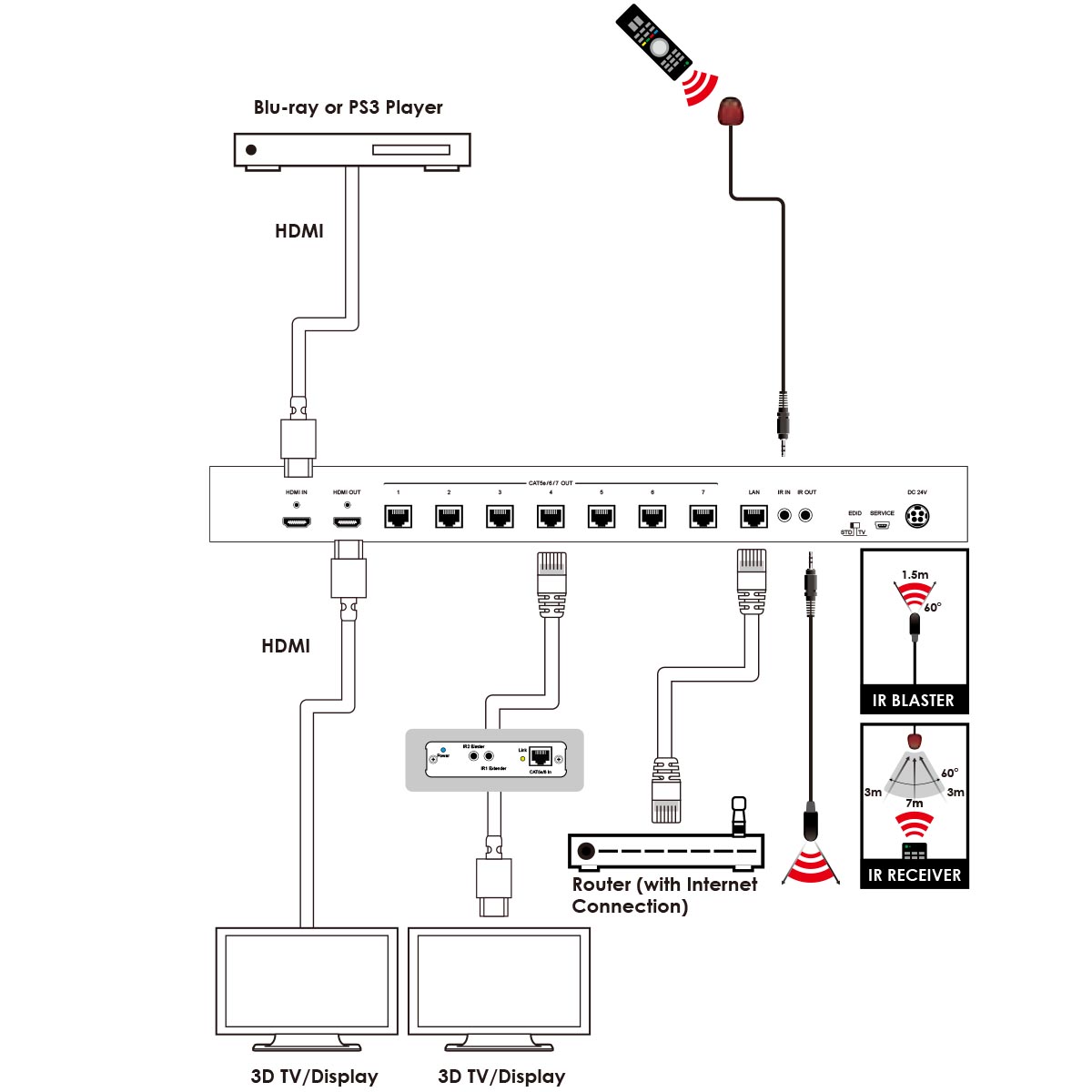 - Supports distances up to 100 meters through CAT5e/6/7 cables
