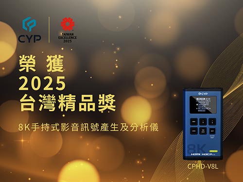 西柏科技產品《8K手持式影音訊號產生及分析儀》榮獲2025台灣精品獎的殊榮! 未來CYP將持續投入研發,創造更多創新產品,為影音整合應用貢獻心力。