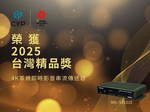 西柏科技產品《4K軍規即時影音串流傳送器》榮獲2025台灣精品獎的殊榮! 未來CYP將持續投入研發,創造更多創新產品,為影音整合應用貢獻心力。