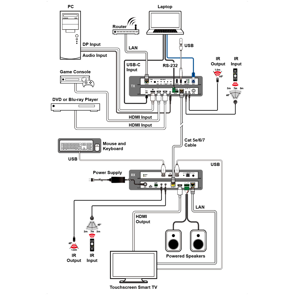 - 支援 HDBaseT 功能包含HD 影像及音訊、PoH (PD),以及控制延伸(雙向的 IR/RS-232/USB)